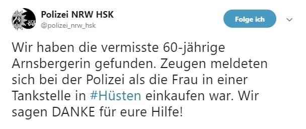 UPDATE: Die Frau wurde gefunden! Ähnliche Inhalte: Polizei: Hubschraubereinsatz über Arnsberg-Hüsten 15-jährige Schülerin vermisst Beitrags-Navigation Autobrand in Niedereimer Einbrüche im Stadtgebiet