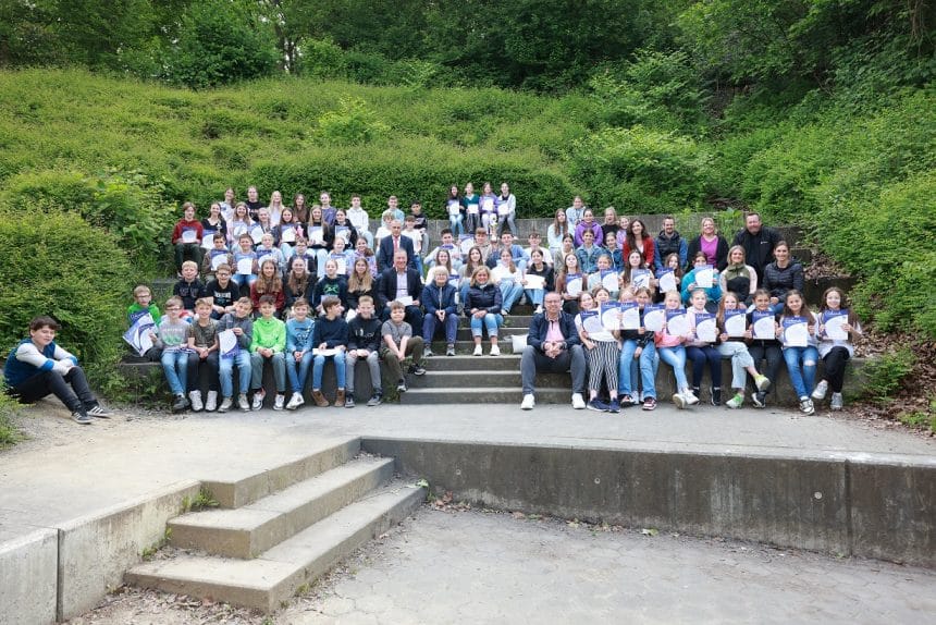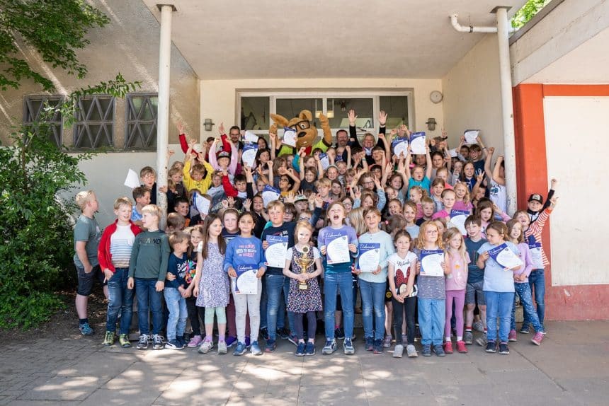 Marion Spitczok von Brisinski, Schulleiterin der Städt. Kath. Bekenntnisgrundschule St. Josef-Bergheim, freute sich mit allen Schüler:innen und Lehrer:innen über den ersten Platz als leistungsstärkste Grundschule. Sie richtete lobende Worte an ihre Schülerschaft und zusätzlich gab es noch einen großen Wanderpokal und einen Gewinn von 150 Euro für die Schulkasse.